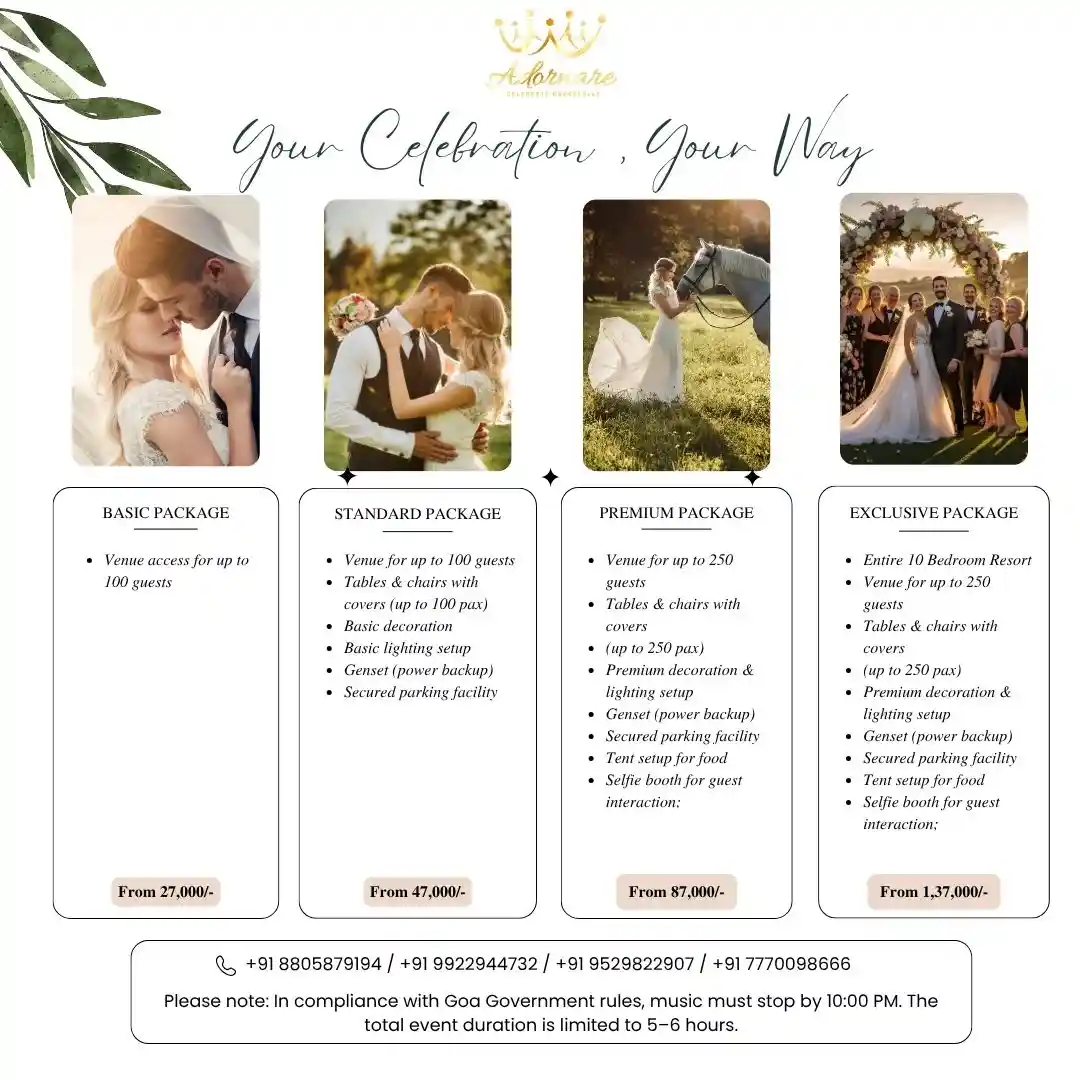 At Adornare, our open-air event venue in Saligao, North Goa, we’re dedicated to bringing your vision to life and creating an unforgettable experience for you and your guests. Whether you’re planning a wedding, party, or special event, we invite you to discover the magic of our stunning outdoor setting. Contact us today to learn more about our venue and start planning the event of your dreams.